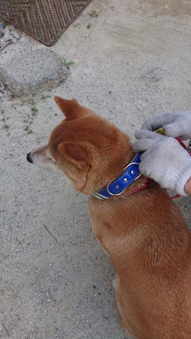 手入れ時に首輪の脱着練習しています。以前から触って慣らしてきた効果が出ました。
