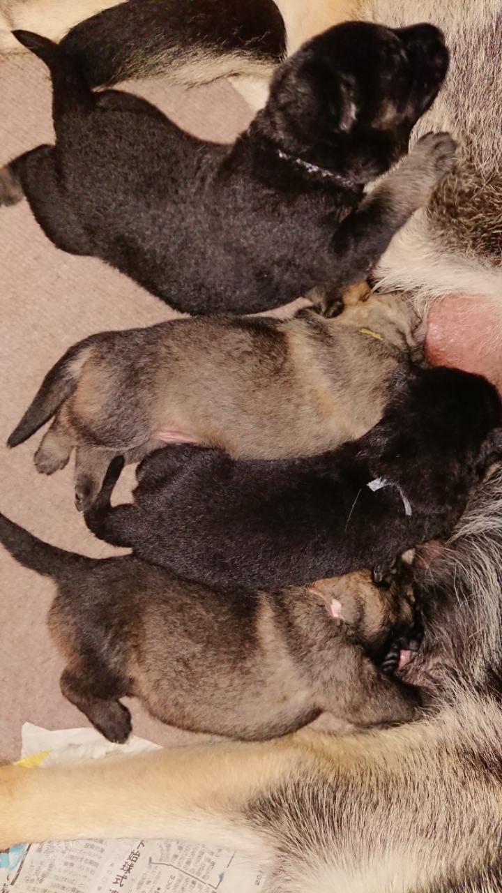 オス4頭(ウルフ色2頭、ブラックタン色2頭)です。両親共に日本足跡追及訓練チャンピオングループ、嘱託警察犬県大会優勝歴有(奈良、和歌山)。
