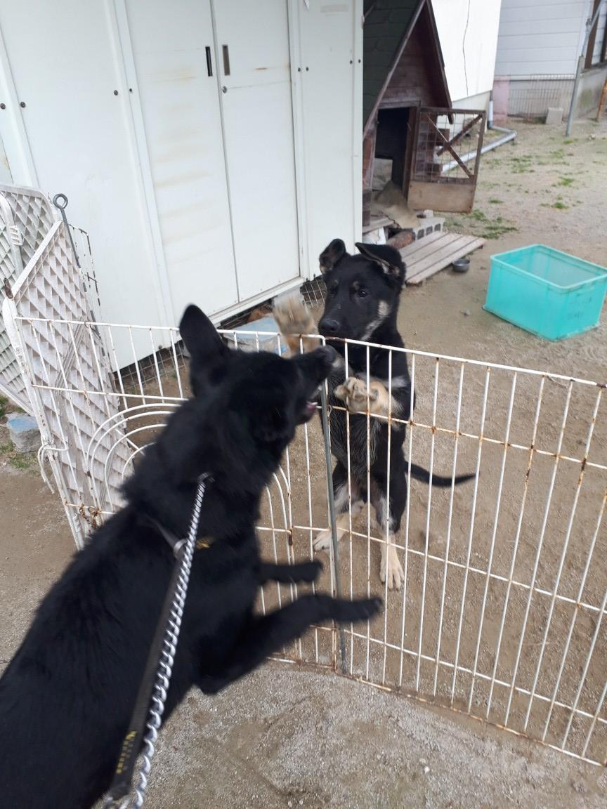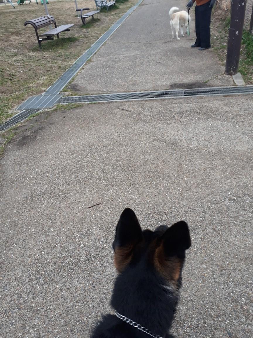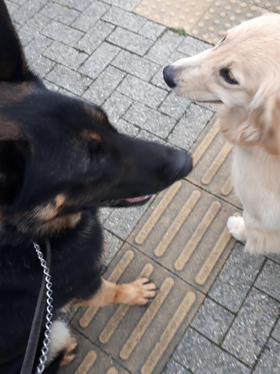 降車直後のまだテンションが高い排尿時に、近くを通った犬に目を付ける素振りを見せたので、軽くリードの操作で抑えたら以後は態度改め犬に対して敵対行動や興奮は無しでした。(バーニーズの興奮声やフェンス内から吠える日本犬雑種に対しても)