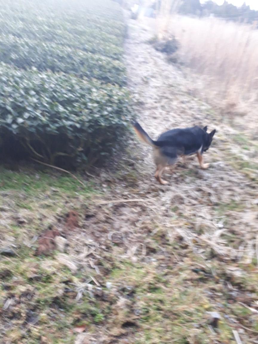 他の犬の臭いの多い植木の際を歩いて、脚側に付く意識付け強化。