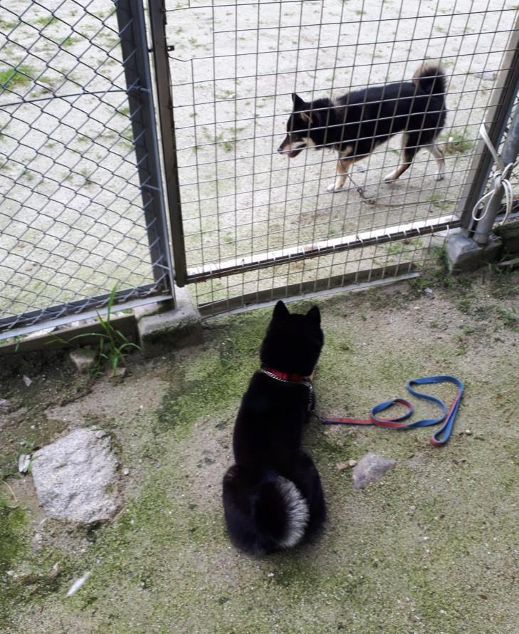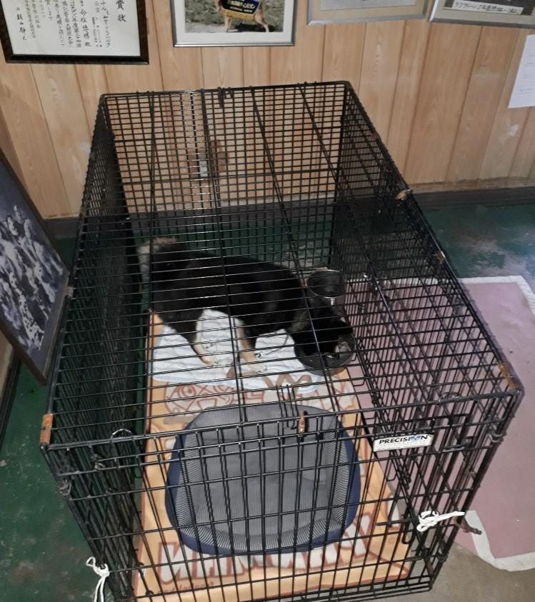 イノちゃん、他の犬と離していると落ちついて良いのですが、動かないと腹もへらないと思い、日中は皆の近くの犬舎にしました。