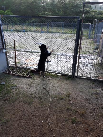尻尾を垂れ、じっと動かないかフェンスに飛び付いて、「ここから出たい!」