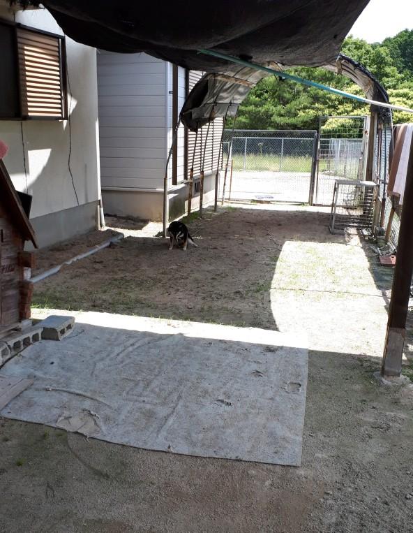 イノちゃん、早朝から陽があたる迄の時間帯は表のサークルが犬舎がわりで落ち着きます。