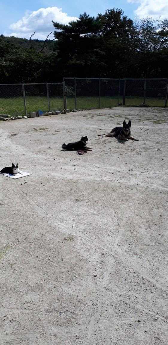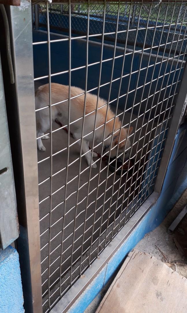 犬舎に入って行っても1m半以上近づくと唸るので、ビスケットを置いて出ます。姿を隠すと食べ始めます。
