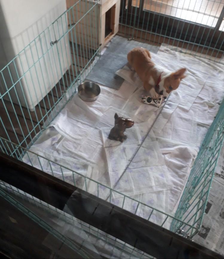 マル(オ)君、人が居てると排尿しにくいので離れてそれとなく見ていた後、褒めてあげようとサークルに近付いていくと、叱られるのではないか?という態度をする。