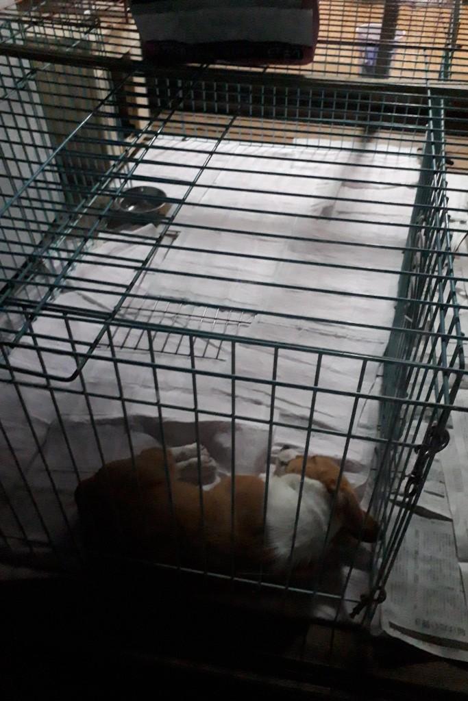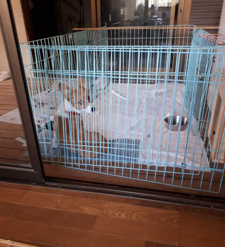 マル(オ)君、人が居てると排尿しにくいので離れてそれとなく見ていた後、褒めてあげようとサークルに近付いていくと、叱られるのではないか?という態度をする。