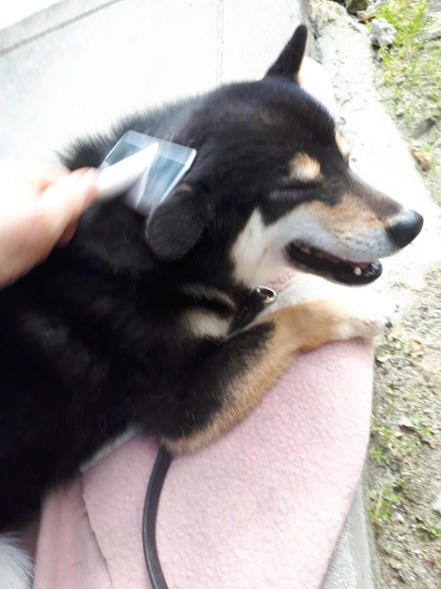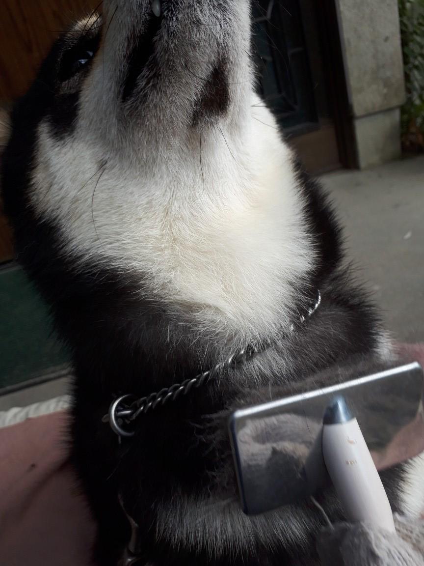 ブラッシングも当たり障りなくしていたら、「穏やかに」という御希望に添えないので、ドラキュラ顔をしやすい前胸、片足持っての下胸をする。