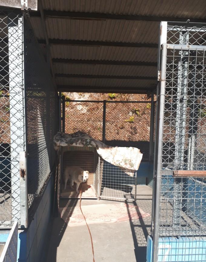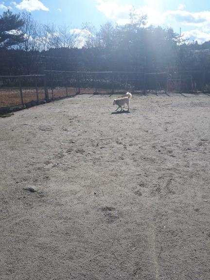 ほこり君、最近は自ら小さい犬舎に入ったり出たり。