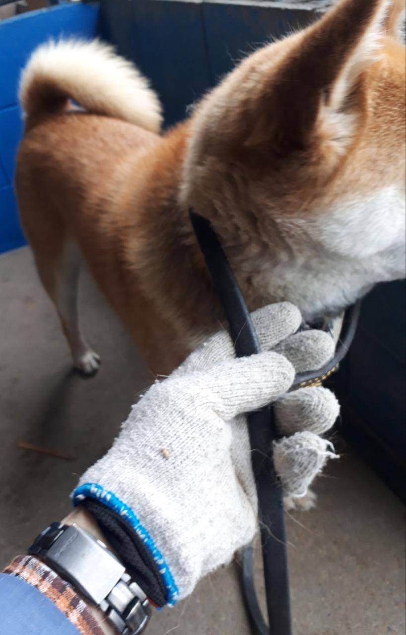 皮の首輪で脱着の練習。