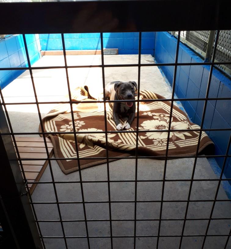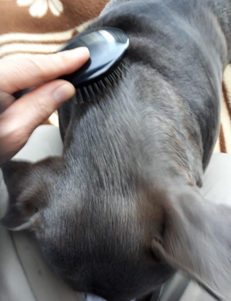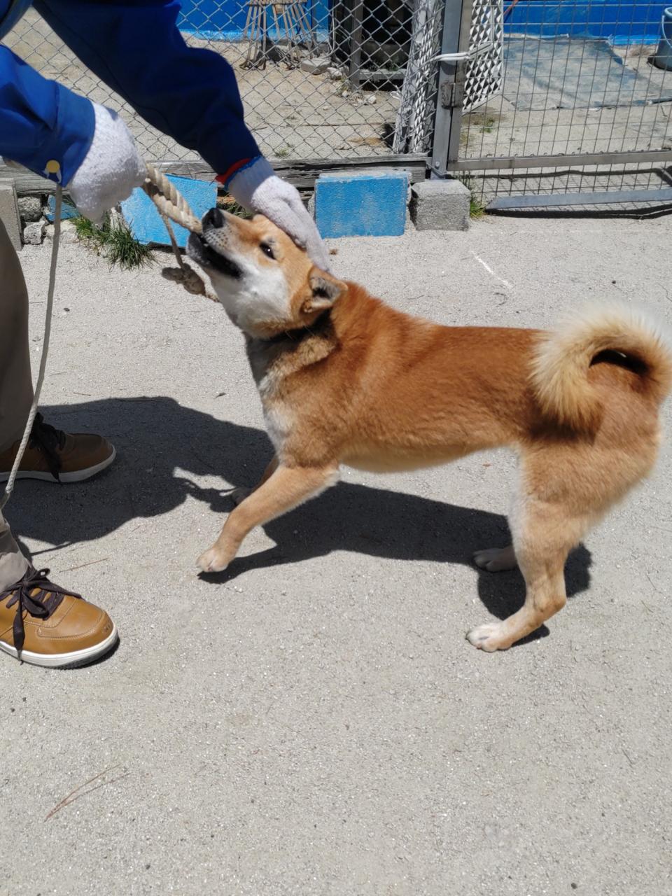 頭上に手をかざされるのを好まないむぎ君、遊びながら頭に手をやる練習。