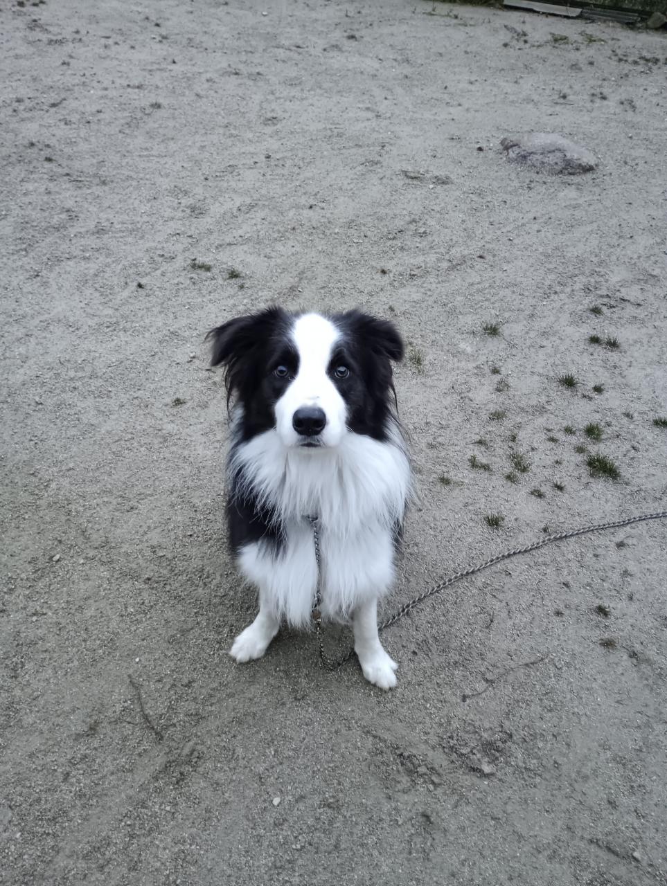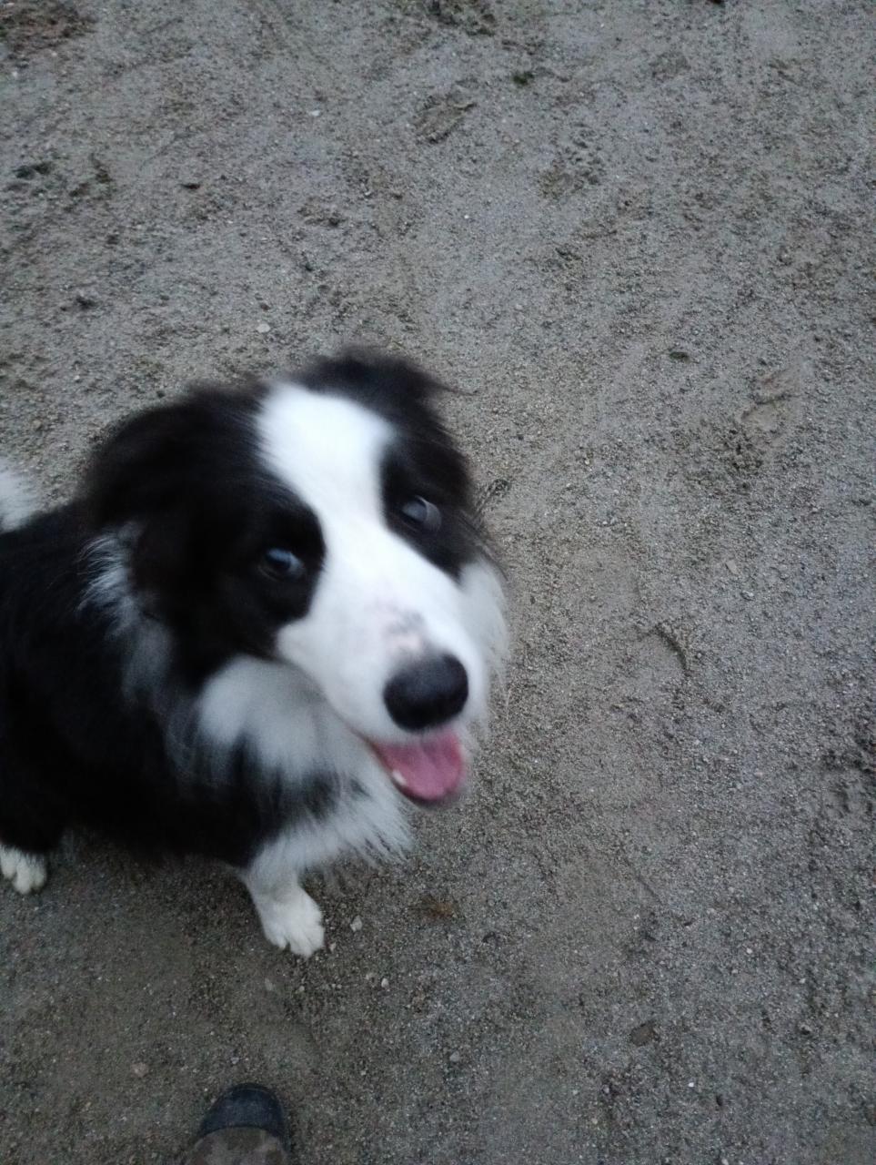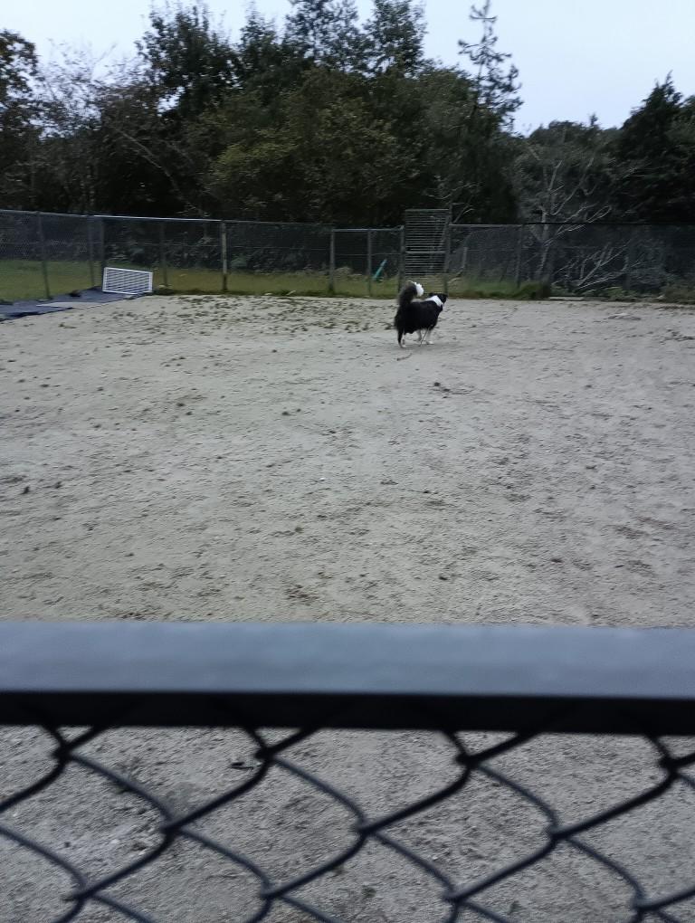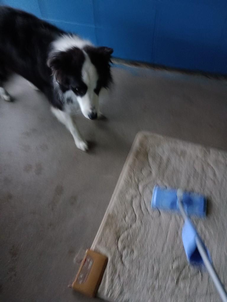 興奮せずだが前脚でちょっかいを出しかけたので「止め」。